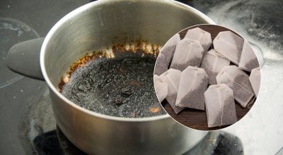 ขอแนะนำให้แช่หม้อและกระทะในน้ำอุ่น ใส่ถุงชาที่ใช้แล้วทิ้งไว้หลายชั่วโมง